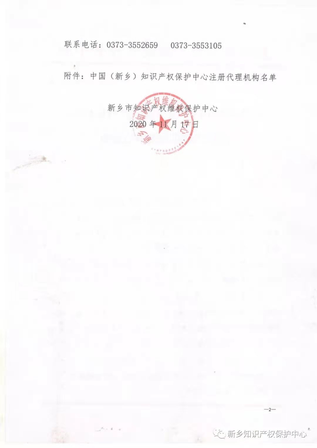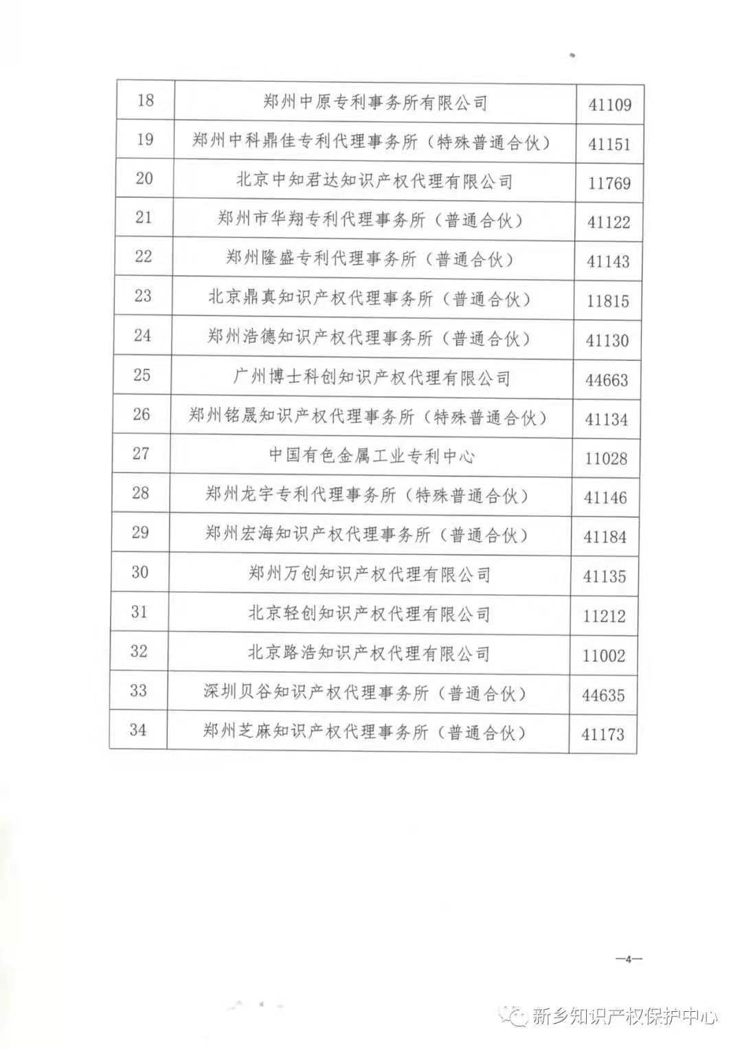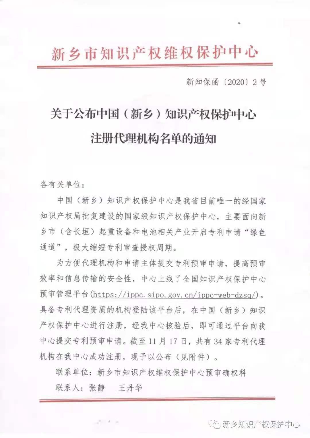 关于公布中国(新乡)知识产权保护中心注册代理机构名单的通知